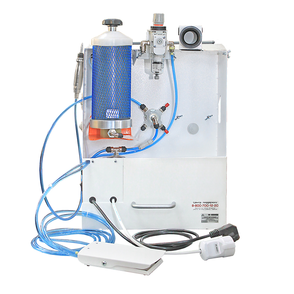 Включение вытяжки происходит автоматически при нажатии педали пескоструйного аппарата. В качестве вытяжного агрегата рекомендуем УПЗ 7.2 НЬЮ (многофункциональную вытяжку со встроенным циклоном и мини-столешницей), либо УПЗ 5.0 НЬЮ КОМБИ (мобильную вытяжку УПЗ 5.0 НЬЮ в комплекте с фильтр-циклоном АФЦ 1.0 НЬЮ), либо УПЗ 5.0 НЬЮ.