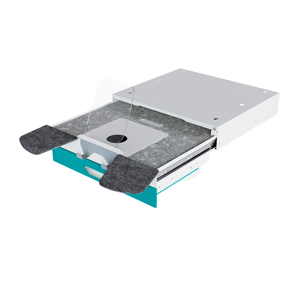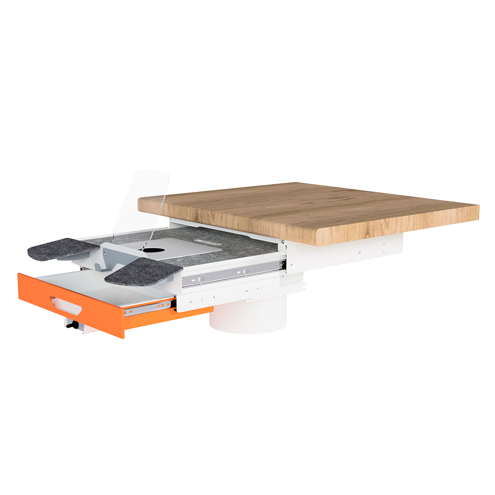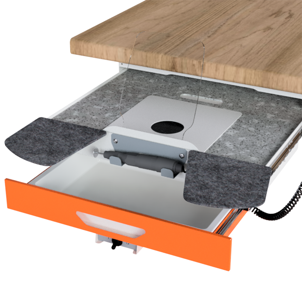 - организация двухуровневого рабочего места: основная столешница для чистых работ, выдвижная столешница для работы с бормашиной;
